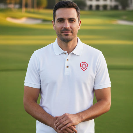 Lion Shield Red and White Pattern Print Short Sleeve Polo (Classic Fit)